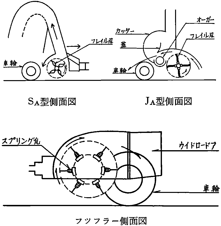 試験番号No1、No.2の試験では、SA型を使用し、刈取と同時に、第1図のごとき吹きだしを通して後方に放擲して行き、半日に1回程度の割合でワツフラによる反転を行い、乾燥が終了した後サイドレーキで集草し、普通のメデイアムデンシテイヘイベーラで拾上結束を行った。No.3ではJAを使用し同様に結束収納を行った。含水率は、地乾列約50m長さの各区内の数ヶ所より、試料を取り細断して混ぜ合わせ、ケット赤外線水分計で測定した。ザイドレーキ(フインガーホイール型)による集草時の損失は、レーキ通過後、作業巾2m×5mの調査区5区を設け、各区より人手により地面に残っていた細断牧草を拾い取り反当収量から計算した。ベーラによる拾上げ損失は、ウインドローの長さ5mの区を5つ設け、ベーラ通過後、同様に人手により拾上げて計算した。これらは両方共No.2試験で行った。No.3では、圃場損失は、一見あまり差がないようであったので、各損失測定を省略し、ヘーベーラを使用した後の圃場において、任意に10m×10m区を5ヶ設け同様に測定した。フオーレージハーベスタによる拾上損失はベーラの場合と同様である。なお、ベールの長さは、約45㎝程度にし、ワツフラーはフオーレージハーベスタ区は全て、ドアを全閉の状態で行った。細断長さの調査は、刈取直後の飼料を約1㎏をとり、各長さの区分に分け、乾燥後重量を測定し計算した。なお作業速度はSA0.62m/s、JA;1.12m/s、ワツフラー、サイドレーキ;1.62m/s
