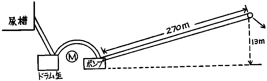標高差13mの沢にいったん尿を落してポンプ位置から270m先に尿を圧送し送水量を測定する。圧送用ホース1本(270m)に供試機を順次とりつけ行う。