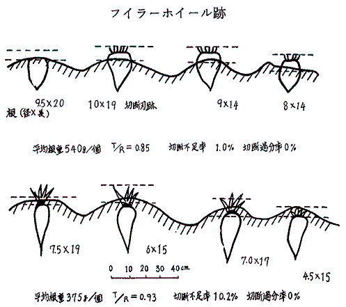 切断された根部を過不足なく、手なおしした根重aとし手なおしした量をbとすればb/a+b×100を切断不足率とする。