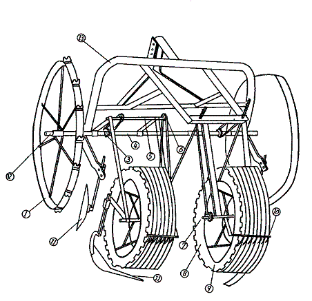 15PS級の小型トラクターの後部三点油圧装置によって支持され、2畦用であり、畦巾60?pにてきするが、55?pにも調節し得る。タツピングは傾斜するナイフで行うが、ナイフの直上に装置されているフイラーホイールによって切断厚さが規制される。フイラーホイールは駆動車輪の回転によって回転し、前進速度に対し、1.4周速度を有する。フイラーホイールとタツピングナイフとの間隔がビートの地上高の高低により、自動的に調節される様リンク機構が設けられている。