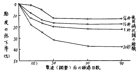 しかしこの種接着剤の粘度は、従来の諸研究の結果から、製造(調製)後も硝化綿の種類および溶剤の組成によって粘度の経時変化におよばす影響がことなることが明らかにされているので(第2図参照)、実際的にこの種接着剤の粘度を考える場合は相当安定したとみられる使用時のものでなければならない。
