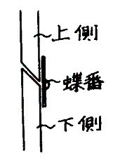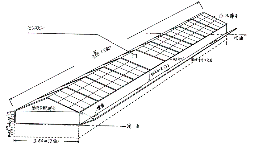 第2・3図に示すように横框を半分の巾(15cm)にして蝶番で組合せ外開きとした。(下側半分は地中に埋め、上側は外に開くようにした)べるの鈴鳴後人力で開き床内温の低下と共に再び人力で閉めた。なお横框の上下を蝶番で連結する場合、下図のように斜めにつなぎ閉じている時の外気の通風を極力さけるようにした。