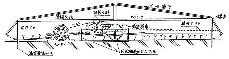 昭和35、36年はベルの鈴鳴後モーターに通電し、床内温低下後は電気を切りモーターを止めた。昭和37年はセンスビーより電磁開閉器が動きモーターに自動的に通電される。モーターが回転すると操作ロットにより横框が連続開閉し床内温を調節する。つぎに床内温が低下すると全く同様な方法でセンスビーにより電磁開閉器に働きモーターが自動的に停止し横框が閉じるようにした。なお、温度の測定は点式抵抗温度計、自記地水温度計により測温した。