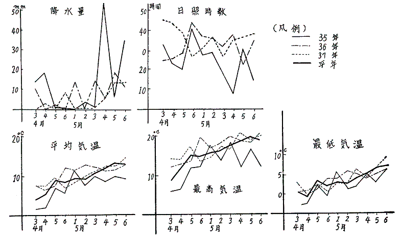 3ヵ年共に播種期は4月25日で苗代期間の天候は昭和35年が低めに36年は高めに37年はほぼ並に経過したが苗の生育は35年においてもほぼ順調であった。