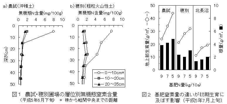 1.土壌の異なる2試験地で施肥試験を行った。北長沼の土壌は細粒な火山性土で、砕土性が良く、保水性が高い。農試の土壌は粘質な沖積土で、砕土性が比較的劣り、保水性が低い。穂別の土壌はやや粗粒な火山性土で、それらが両者の中間に位置する。施肥窒素の土壌中での拡散は火山性土で大きく、沖積土で小さい(図1)