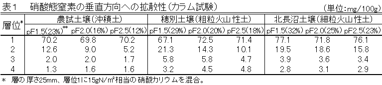 2.更に、土壌水分別の施肥窒素の拡散性をカラム試験で行った。保水性が高い北長沼>穂別>農試の順に拡散度合いが大きく、保水性が低い土壌ほど土壌水分が変化するとその度合いが大きく変化する(表1)。