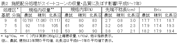 4.スイートコーンの収量、品質は施肥配分により影響されるが、その程度は土壌により異なる(表2)。