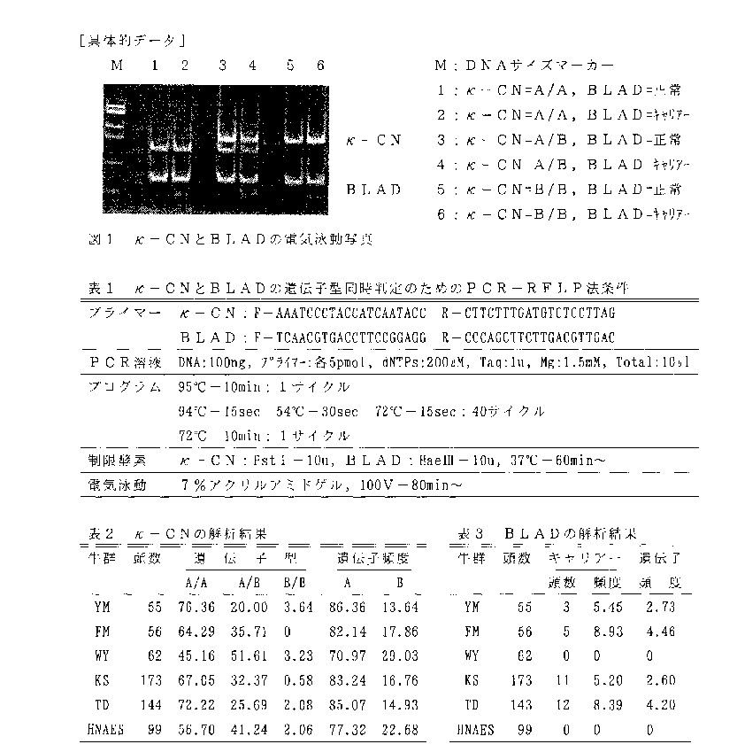 GenBank(NCBI)に登録されているκ−CNとCD18(BLADの原因遺伝子)の塩基配列情報よりプライマーを設計した。PCR法でDNAの目的領域を同時増幅した後、2種類の制限酵素で同時消化を行い、遺伝子型はポリアクリルアミドゲル電気泳動法で同時検出した。