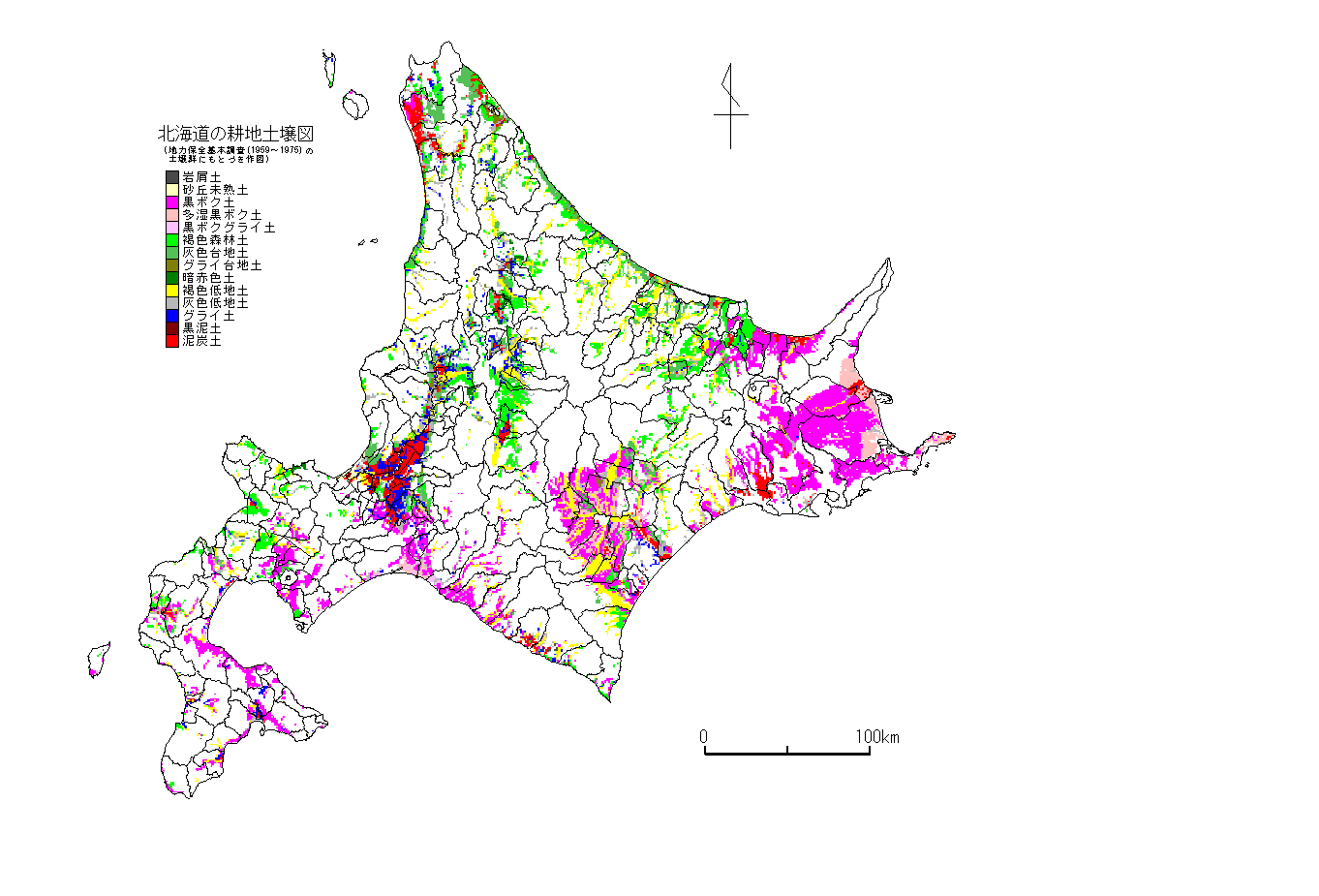 以下の土壌図は、地力保全基本調査による農耕地の土壌分布を土壌群を単位として国土数値情報の3次メッシュ形式で表示したものです。