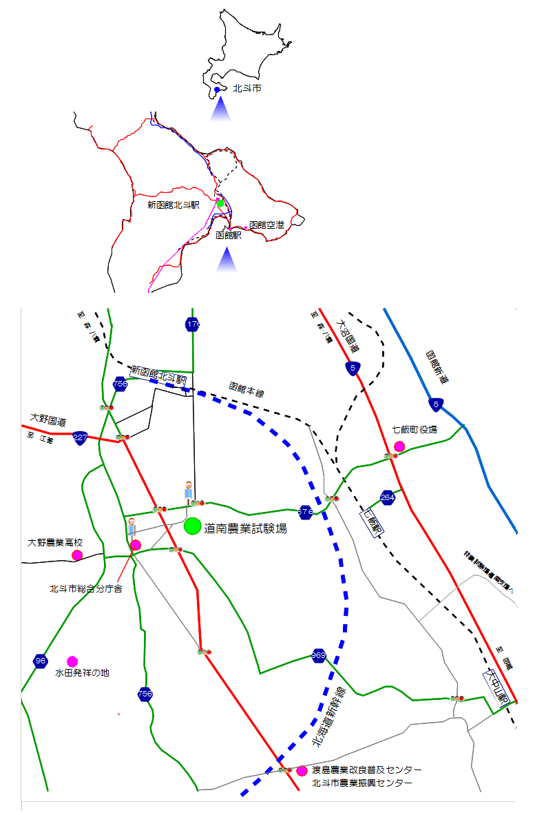 函館バス(21、32、25、610系統)総合分庁舎前下車→徒歩15分(1km)※便数は1時間に0~1本程度