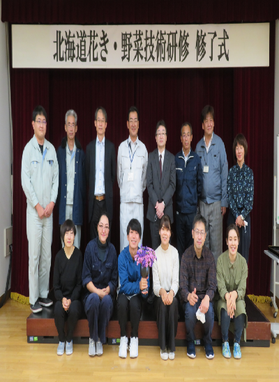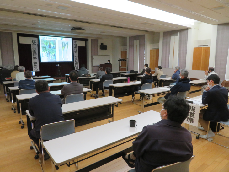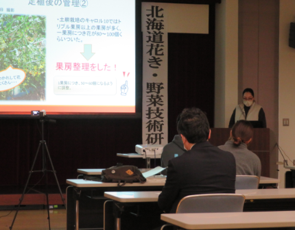 総合技術研修では、野菜と花の道内主要品目を共通カリキュラムで研修しますが、それとは別に研修生各々が課題を持って品目を選定して栽培に取り組む自主栽培品目の報告会です。