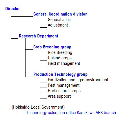 The organization comprises of five main research department. Kamikawa Agricultural Experiment Station (AES) is one of the eight AES under the agricultural research department.