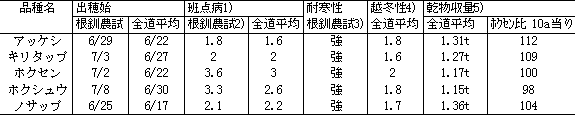 3)根釧農試の耐寒性検定試験による。 4)越冬性は数字が小さい程良好。
