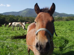 夏の放牧の様子。ドサンコはおとなしくて人なつこい性格をしています。