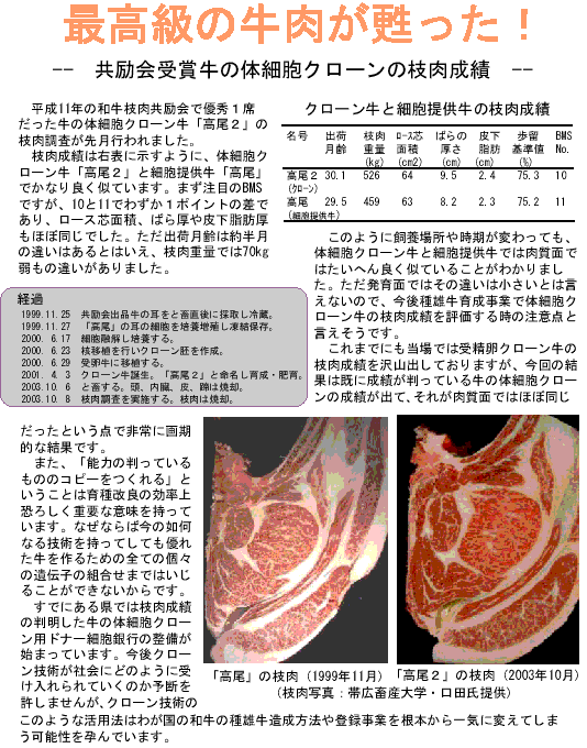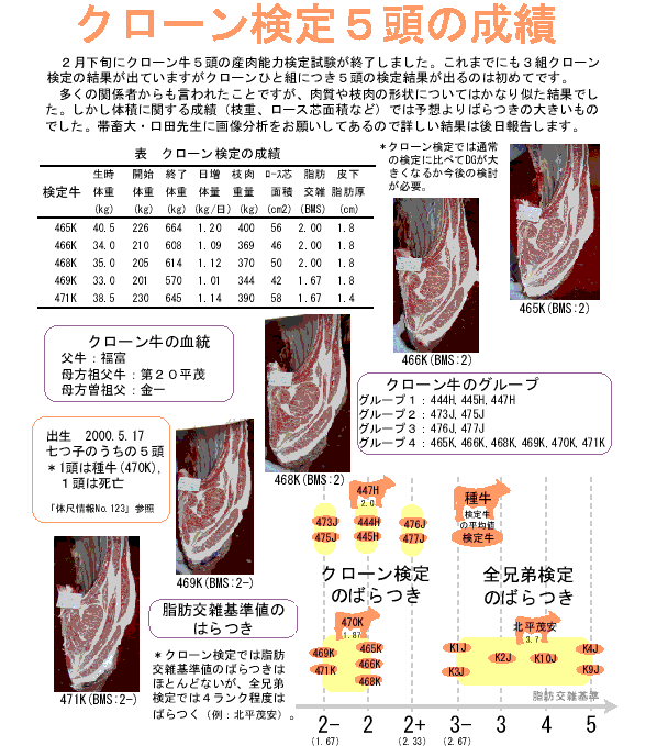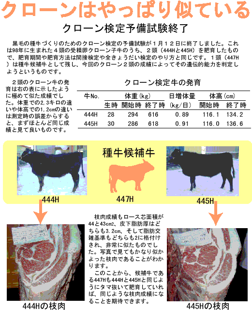 ・ 「深晴波」産子の子牛市場出荷頭数1,000頭突破No.4( 前半 ・ 後半 ) ・ 「第7茂糸」体細胞クローンの枝肉成績が出ました No.3( 前半 ・ 後半 ) ・ 「深晴波」娘の哺育能力について