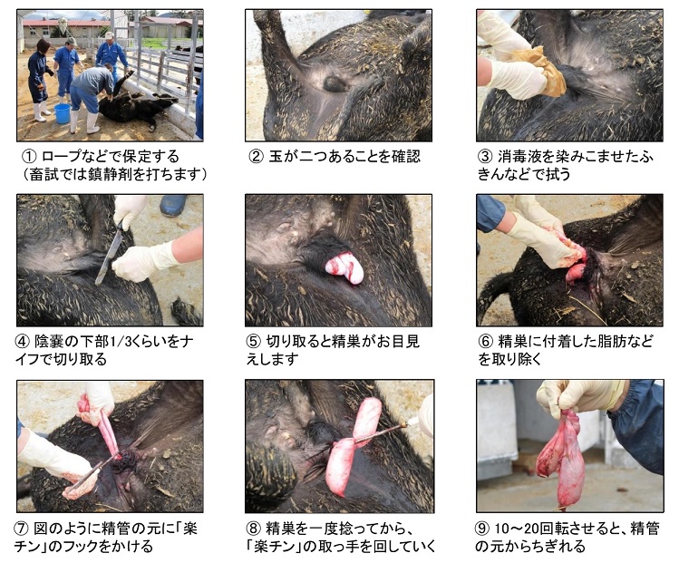 「楽チン」による2玉同時捻転法は、陰嚢の切除から精巣を摘出するまでにかかる時間が1頭あたり1分程度(従来法は5分)なので、牛にかかるストレスが軽減されます。従来法では、去勢後はしばらくぐったりしていましたが、この方法では鎮静剤がきれるとすぐに歩きまわる牛も多く見られます。また、術者への負担、術中のリスクが軽減できるメリットもあり、いいことずくめです。