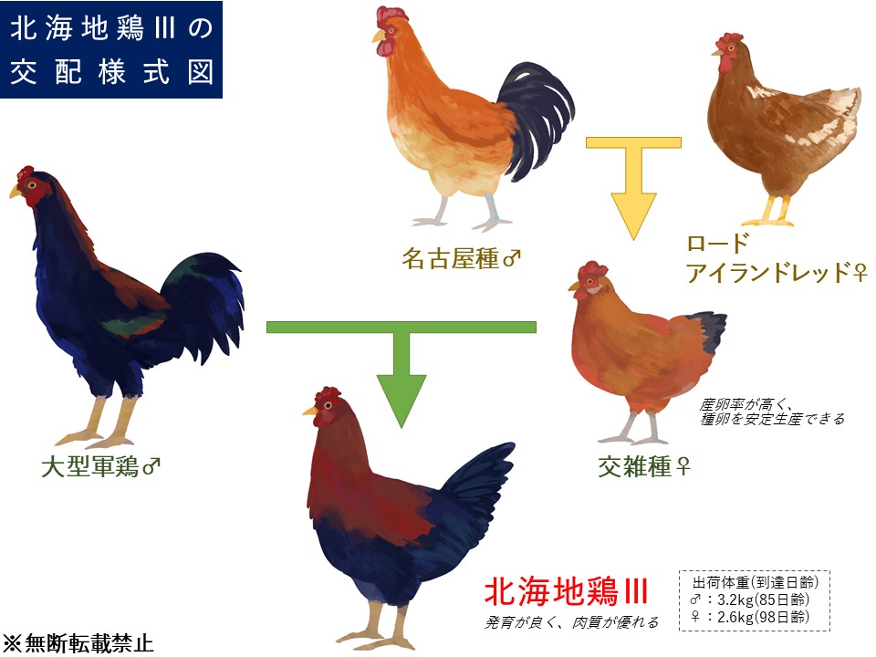 交配様式は名古屋種(N系)の雄とロードアイランドレッド種(P9系)の雌を交配した雌種鶏(交雑鶏)に、大型シャモ(833系)の雄種鶏を交配した三元交雑鶏です。