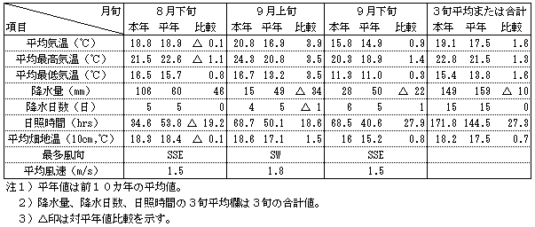 Ⅰ 気象概況8月下旬から9月中旬までの気象は以下のように推移した。 |