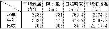 | 8月下旬: | 平均最高気温が21.5℃(対平年値比-1.1℃、以下同様)と 平年よりやや低かったが、平均最低気温が16.5℃(+0.8℃) と平年よりやや高かったため、平均気温は18.8℃(-0.1℃) とほぼ平年並であった。降水量は106mm(177%)と平年より 多く、日照時間は34.6時間(64%)と平年よりやや少なかっ た。平均畑地温はほぼ平年並であった。  |