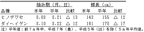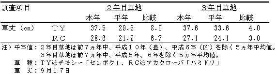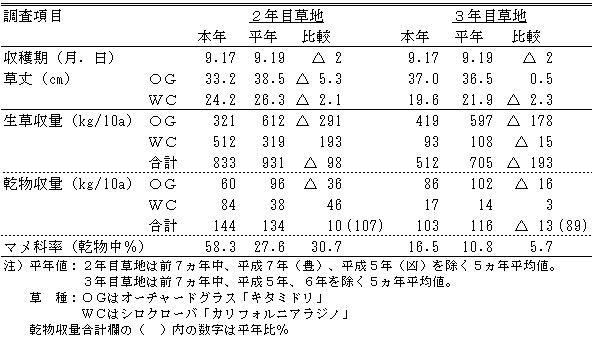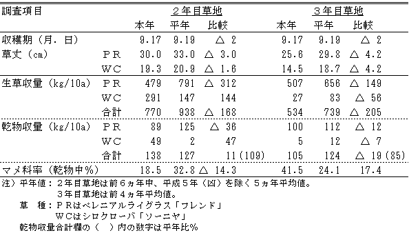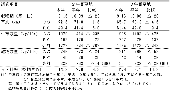 |  以上、この期間を要約すると、平均気温は9月上旬が20.8℃(+3.9℃)と平年より高く、その他の旬が平年並から平年よりやや高かったため、、3旬の平均で19.1℃(+1.6℃)と平年より高かった。降水量は8月下が多かったが、9月上~中旬はやや少なかったため、3旬の合計は149mm(94%)とほぼ平年並であった。日照時間は8月下旬が平年よりやや少なかったが9月上~下旬は平年よりやや多くから多く推移したため、3旬の合計で171.8時間(119%)とほぼ平年並であった。平均畑地温は平年から平年よりやや高く推移した。  4月からの主気象要素の積算値は、平均気温、日照時間、平均畑地温は平年並に推移している。降水量は781mm(164%)と平年より多く推移している。 a.季節表 ![]() b.主気象要因積算値(4月21日~9月20日) ![]() Ⅱ 作況1.牧草1)採草型-Ⅰ(TY・RC) 3番草 作況:やや良 事由:草丈はチモシーが4.1~8.0cm、アカクローバは3.0~6.7cm高かった。 以上により作況はやや良である。 ![]() 2)採草型-Ⅱ(OG・RC) 3番草 作況:平年並 事由:収穫期は平年より20~23日早かった。草丈はオーチャードグラスが2年目草地で1.8cm高く、3年目草地で4.6cm低く、アカクローバは8.0~9.4cm高かった。乾物収量は2年目草地、3年目草地ともオーチャードグラスが少なく、アカクローバが多かった。合計乾物収量は2年目草地で平年比99%、3年目草地で90%、平均95%であった。 以上により収穫期が早かったことも考慮し、作況は平年並である。 ![]() 3)放牧型-Ⅰ(OG・WC) 5番草 作況:平年並 事由:草丈はオーチャードグラスが2年目草地で5.3cm、シロクローバが2.1~2.3cm低かった。乾物収量は2年目草地、3年目草地ともオーチャードグラスが少なかったが、2年目草地ではシロクローバが多かった。合計乾物収量は2年目草地で平年比107%、3年目草地で89%、平均98%であった。 以上により作況は平年並である。 ![]() 4)放牧型-Ⅱ(PR・WC) 5番草 作況:やや不良 事由:草丈はペレニアルライグラスが3.0~4.2cm、シロクローバが1.6~4.2cm低かった。乾物収量はペレニアルライグラスが2年目草地、3年目草地とも少なく、シロクローバが2年目草地で多く、3年目草地とも少なかった。合計乾物収量は2年目草地で平年比95%、3年目草地で85%、平均90%であった。 以上により作況はやや不良である。 ![]() 2.サイレージ用とうもろこし 作況:平年並 事由:発芽期は両品種とも4日早く、発芽は順調であった。 稈長は平年よりヒノデワセで12cm、ダイヘイゲンで17cm短かった。しかし、抽糸期は平年より早く、子実の熟度は平年より進んでいると思われる。 以上により、作況は平年並である。 ![]()  |