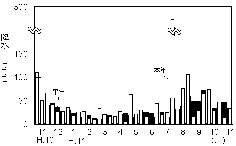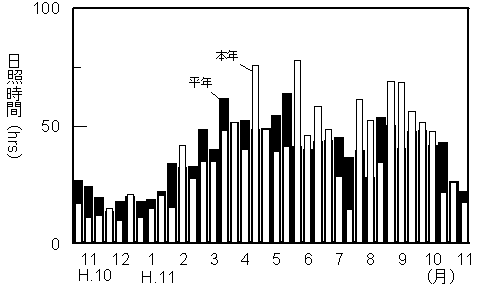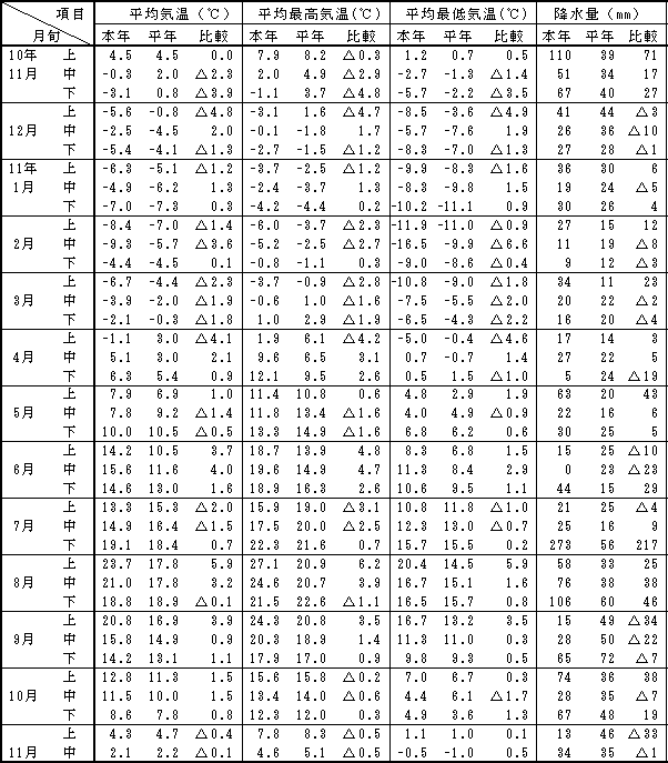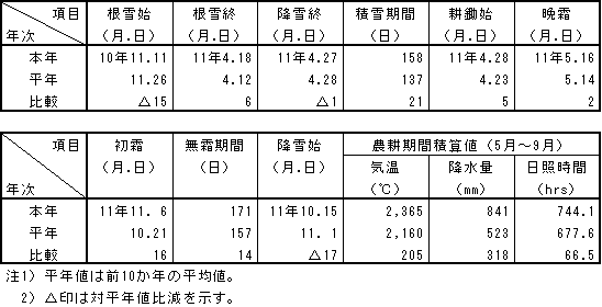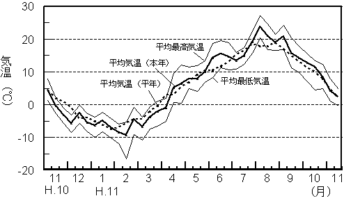 |  平成10年11月上旬から平成11年11月中旬までの気象は以下のように経過した。  根雪始は平成10年11月11日で平年より15日早く、根雪終は平成11年4月18日で平年より6日遅かった。  |