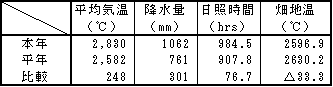 | 5月: | 平均気温は上旬で平年よりやや高かったが、中~下旬は平年よりやや低く推移した。降水量は3旬とも平年より多く推移し、特に上旬は63mm(315%)と平年より多かった。日照時間は平年並から平年よりやや少なく推移した。 |