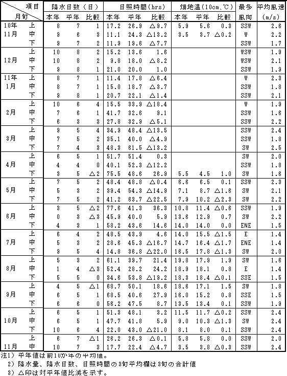 | 10月: | 平均気温は3旬とも平年よりやや高く推移した。降水量は中旬で平年よりやや少なかったが、上旬で74mm(206%)、下旬で67mm(140%)と平年より高かった。日照時間は上~中旬で平年並であったが、下旬は22.0時間(51%)と少なかった。 |