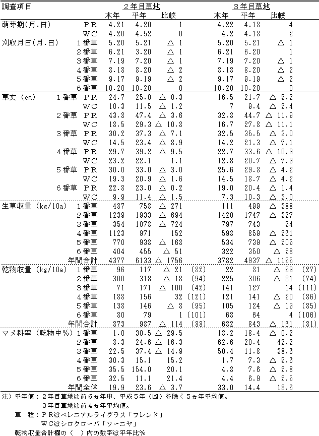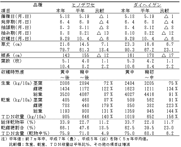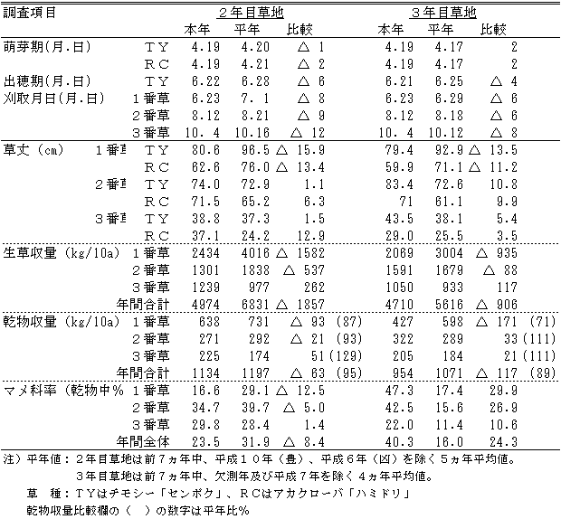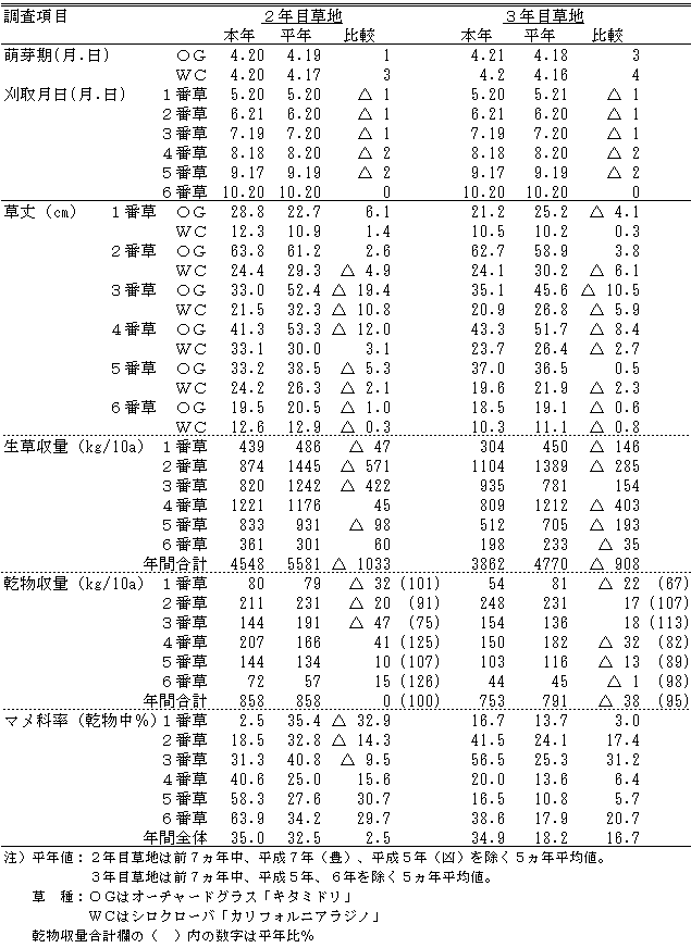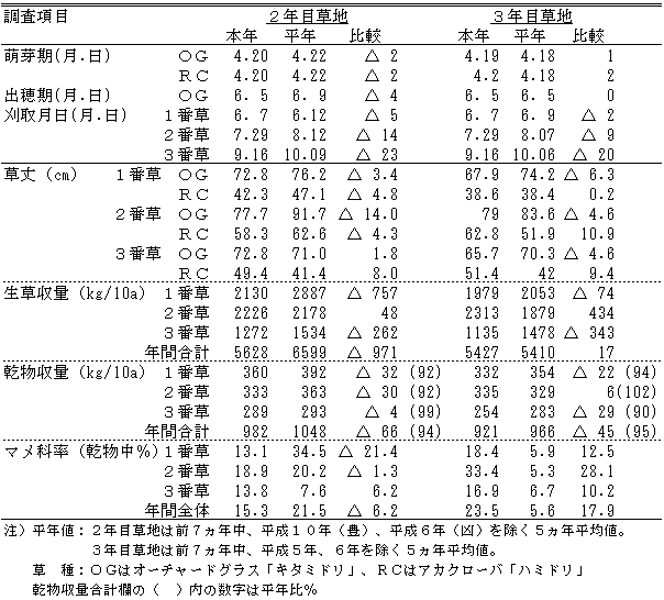 |  晩霜は平成11年5月16日、初霜は11月6日で無霜期間は171日となり、平年より14日多かった。降雪始は10月15日で平年より17日早かった。  a.季節表 ![]() b.牧草生育期間の主要気象要素積算値(4月21日~11月20日) ![]() ![]() 図1 気温の推移(平成10年11月上旬~平成11年11月中旬) ![]() 図2 降水量の推移(平成10年11月上旬~平成11年11月中旬) ![]() 図3 日照時間の推移(平成10年11月上旬~平成11年11月中旬) c.季節表 ![]() ![]() Ⅱ 作況1.牧草1)採草型-Ⅰ(TY・RC散播) 作況:やや不良 事由:萌芽期はチモシー、アカクローバともに平年並であった。チモシーの出穂期は平年に比べて4~6日早く、1番草の収穫期は6~8日早かった。草丈はチモシーが13.5~15.9cm、アカクローバが11.2~13.4cm低かった。乾物収量は2年目草地でアカクローバが、3年目草地でチモシーが少なく、合計乾物収量は2年目草地で平年比87%、3年目草地で71%、平均79%であった。1番草は発育が早く進んだものの量的に少なく、作況は不良であった。 2番草は平年に比べて6~9日早く刈り取った。草丈はチモシーが1.1~10.8cm、アカクローバが6.3~9.9cm高かった。乾物収量は2年目草地でアカクローバが少なく、3年目草地ではチモシーが少なく、アカクローバが多かった。合計乾物収量は2年目草地で平年比93%、3年目草地で111%、平均102%であった。作況は平年並であった。 3番草の収穫は平年より12日早かった。草丈はチモシーが1.5~5.4cm、アカクローバが3.5~12.9cm高かった。乾物収量は2年目草地で平年比129%、3年目草地で111%、平均120%であった。 年間合計乾物収量は2年目草地で平年比95%、3年目草地で89%、平均92%であった。 以上により、本年の作況はやや不良である。 ![]() 2)採草型-Ⅱ(OG・RC散播) 作況:やや不良 事由:萌芽期はオーチャードグラス、アカクローバともに平年並であった。オーチャードグラスの出穂期は平年に比べて0~4日早く、刈取りは2~5日早かった。1番草の草丈はオーチャードグラスが3.4~6.3cm、アカクローバは2年目草地で4.8cm低かった。乾物収量は2年目草地で収量は2年目草地で92%、3年目草地で94%で、平均93%であった。作況はやや不良であった。 2番草は平年に比べて9~14日早く刈り取った。草丈はオーチャードグラスが4.6~14.0cm低く、アカクローバは2年目草地で4.3cm低く、3年目草地で1.9cm高かった。乾物収量は2年目草地でオーチャードグラス、アカクローバともにやや少なく、3年目草地ではオーチャードグラスが少なく、アカクローバが多かった。合計乾物収量は2年目草地で平年比92%、3年目草地で102%、平均97%であった。作況は平年並であった。 3番草は平年より20~23日早く刈り取った。草丈はオーチャードグラスが2年目草地で1.8cm高く、3年目草地で4.6cm低く、アカクローバは8.0~9.4cm高かった。乾物収量は2年目草地、3年目草地ともオーチャードグラスが少なく、アカクローバが多かった。合計乾物収量は2年目草地で平年比99%、3年目草地で90%、平均95%であった。刈取が早かったことも考慮し、作況は平年並であった。 年間合計乾物収量は2年目草地で平年比94%、3年目草地で95%、平均95%であった。 以上により、本年の作況はやや不良である。 ![]() 3)放牧型-Ⅰ(OG・WC散播) 作況:平年並 事由:萌芽期は平年に比べてオーチャードグラスが1~3日、シロクローバが3~4日遅かった。1番草の草丈はオーチャードグラスが2年目草地で6cm高く、3年目草地で4cm低く、シロクローバは平年並であった。乾物収量は2年目草地で平年比101%、3年目草地で67%、平均84%であった。作況は不良であった。 2番草は6月上旬に雨が少なく、草丈はオーチャードグラスが2.6~3.8cm高く、シロクローバが4.9~6.1cm低かった。乾物収量は2年目草地で平年比91%、3年目草地で107%、平均99%であった。作況は平年並であった。 3番草は7月上・中旬にかけてやや気温が低く、草丈はオーチャードグラスが10.5~19.4cm、シロクローバが5.9~10.8cm低かった。乾物収量は2年目草地でオーチャードグラスがやや少なく、シロクローバが少なかった。3年目草地ではオーチャードグラスが少なく、シロクローバが多かった。合計乾物収量は2年目草地で平年比75%、3年目草地で113%、平均94%であった。作況はやや不良であった。 4番草の草丈はオーチャードグラスが8.4~12.0cm低く、シロクローバが2年目草地で3.1cm高く、3年目草地で2.7cm低かった。乾物収量は2年目草地でシロクローバが多く、3年目草地でオーチャードグラスが少なかった。合計乾物収量は2年目草地で平年比75%、3年目草地で113%、平均94%であった。作況はやや不良であった。 5番草の草丈はオーチャードグラスが2年目草地で5.3cm、シロクローバが2.1~2.3cm低かった。乾物収量は2年目草地、3年目草地ともオーチャードグラスが少なかったが、2年目草地ではシロクローバが多かった。合計乾物収量は2年目草地で平年比107%、3年目草地で89%、平均98%であった。作況は平年並である。 6番草の草丈はオーチャードグラス、シロクローバともに平年並であった。乾物収量はオーチャードグラスが少なく、シロクローバが多く、合計乾物収量は2年目草地で平年比12