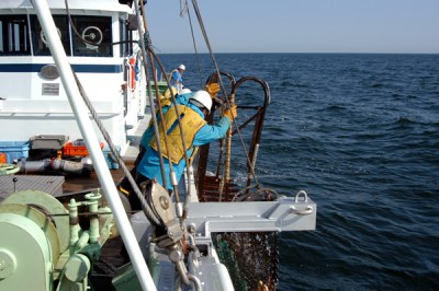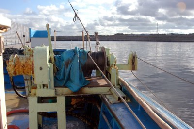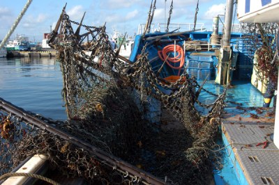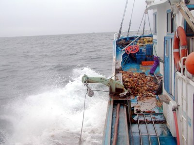 揚網5:次の投網のため、けた網を舷側へ乗せます。