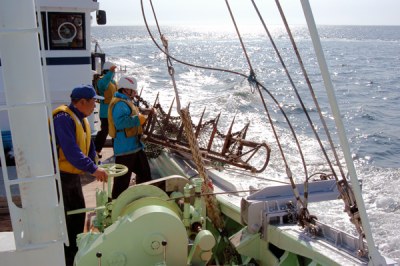 揚網3:けた網を再度吊上げて漁獲物を甲板へ取り込みます。