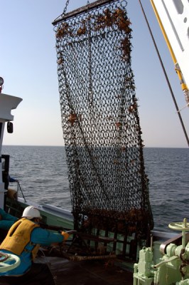 漁具と操業方法はほたてがいけた網漁業と同様であり、両舷からけた網(八尺)を投網し、ワイヤー(80m程度伸ばす)で曳網します。一定時間曳網後、ワイヤーを巻き取り、油圧ドラムでけた網を船上へ取り上げ漁獲します。