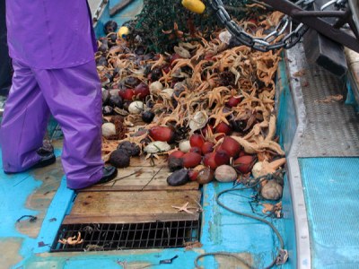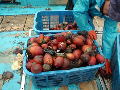 野付漁協のアカボヤは、地域の特産品である「ほや塩辛」の原料として利用されています。ほたてがいけた網漁業の休漁期で、アカボヤの身入りの良い8~10月に操業しています。近年は2隻が操業しており、漁獲はむき身で20トン程度となっています。