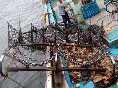 | 漁具 | この地域のホタテガイけた網と同様な仕様であり、船により細部は異なるが、一般的には9本爪けた網(間口約2.7m、爪長さ約70cm)である。 底網(長さ約6m):鉄リング(径10~7cm)、鉄筋網(5寸目(15.1cm)) 天井網(長さ約6m):ハイゼックス(5寸目(15.1cm))、鉄リング(径10~7cm) 脇網:鉄リング(径10~7cm)  |