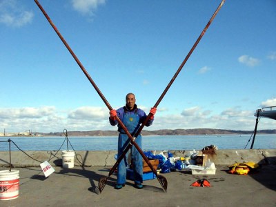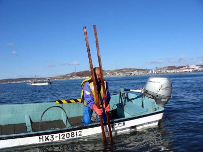 操業1:海底にはさみの先端部を突き刺しアサリを挟みます。体力とコツが必要です。