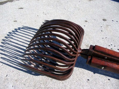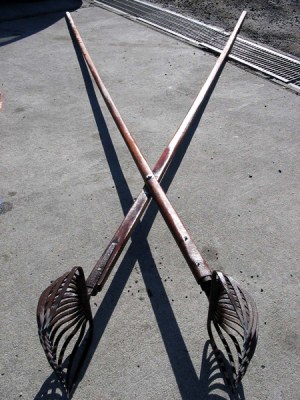 はさみ1:このはさみは全長約4メートルですが、柄の長さの異なるものを使い分ける人もいます。 柄の素材は木製で爪は車のスプリングを使用しています。 はさみ一台当たりの制作費はおよそ7~8万円で、耐用年数は20年程度あります。
