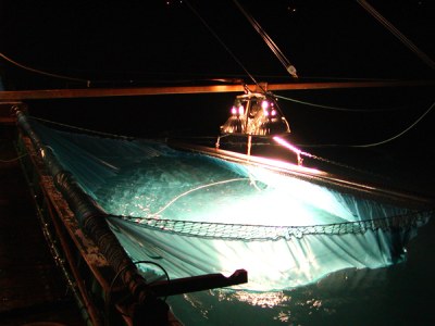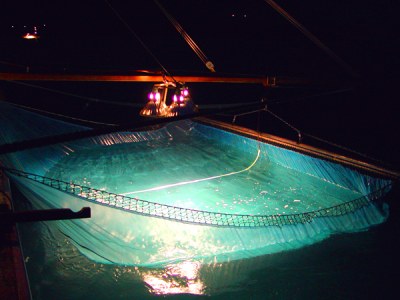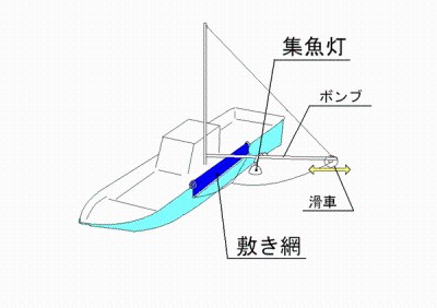 手順1:集魚灯でイカナゴが集まったところに敷き網を垂下します。