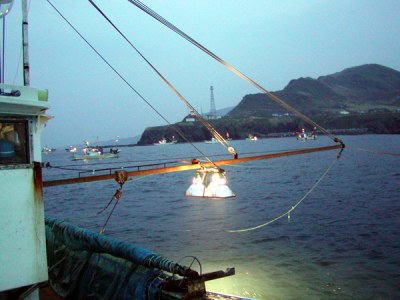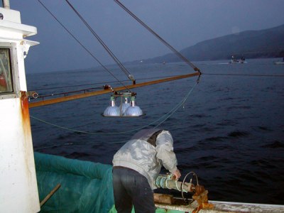 しかしながら、同漁業では、魚群の形成状況によって一晩で少ないときには数kg、多いときでは数百kg以上の漁獲があり、漁期が短く出漁日数が限られる中では、漁獲量が多い日の出漁回数が年間漁獲量を大きく左右し、さらに単価が、漁獲量のほかに魚体サイズによって変化することから、漁獲金額の変動が激しく不安定な漁業といえます。このため、一回の操業でより効率よく漁獲するために無線で情報を交換し、複数の操業ポイントを移動しながら漁を行っています。