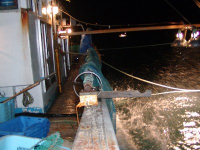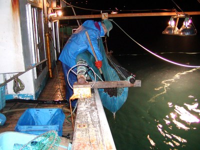 いかなご敷き網漁業は、夜間に集魚灯でイカナゴ稚魚を集め、敷き網ですくい取る漁法です。通常、敷き網は船縁にあるローラー軸に巻き付けられ、操業の際はイカナゴの群れの集まり方によって、網の長さを調整して垂下します。