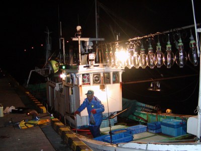 準備:日が落ちる前に、漁場で操業の準備をします。