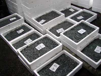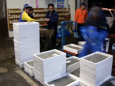 出荷1:イカナゴは発泡スチロール箱に移し替えられ、市場に並びます。