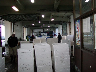 出荷2:盛漁期には市場に所狭しと発泡スチロール箱が並びます。
