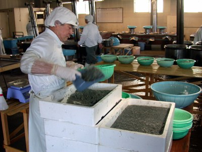 釜炊き1:加工場に搬入されたイカナゴを5kgずつ容器に分けます。