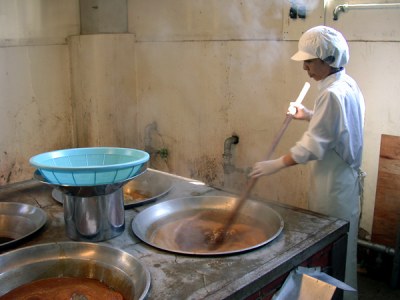 釜炊き3:撹拌しながらイカナゴを煮付けます。
