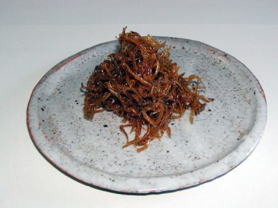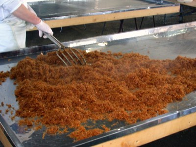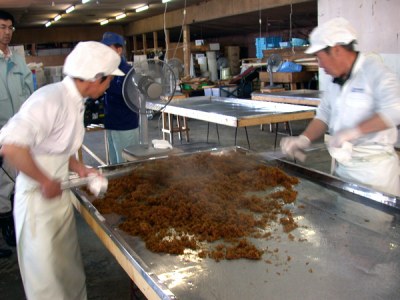 冷却・風乾1:炊きあがったイカナゴを冷却するため広げます。