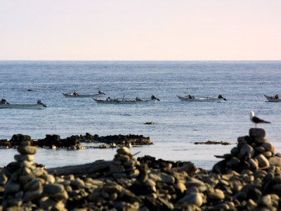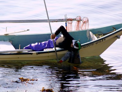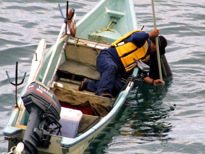 操業1:器用に足で櫂(かい)を漕ぎながらアワビを採取します。