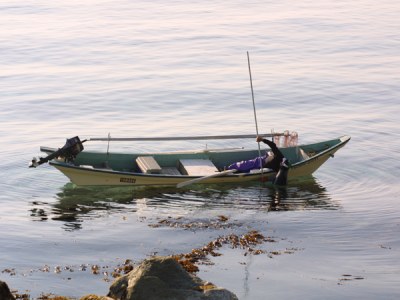 使用漁船:磯舟(船外機船)と長さの異なるたも網です