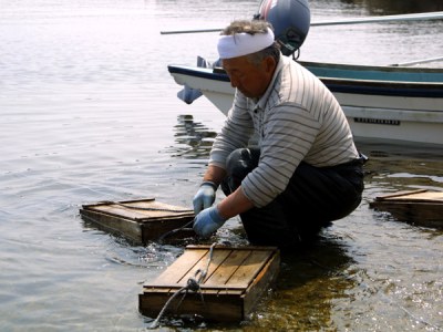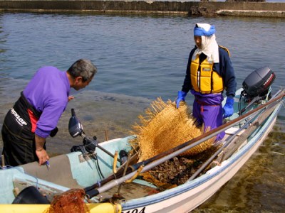 蓄養:船の航行に支障をきたさない海面に吊して作業終了です。