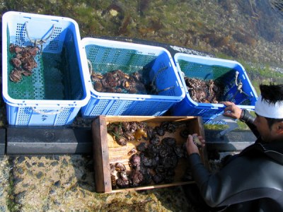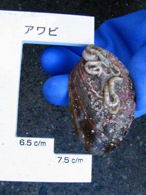 | 漁場 | 水深10m以浅、潮通しの良い岩礁地帯(アワビは大きな岩の下、岩盤の割れ目等に生息する。) |