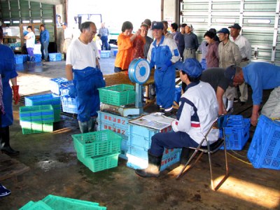 出荷:漁協市場での荷受けの様子。数日間蓄養して数量がまとまったアワビを出荷します。