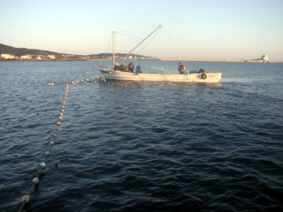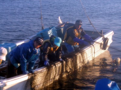 網起こし1:網起こしには2隻の船外機船を使用します。